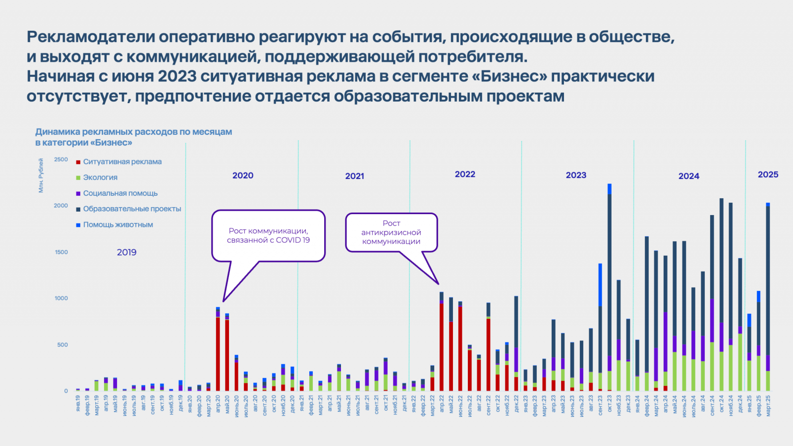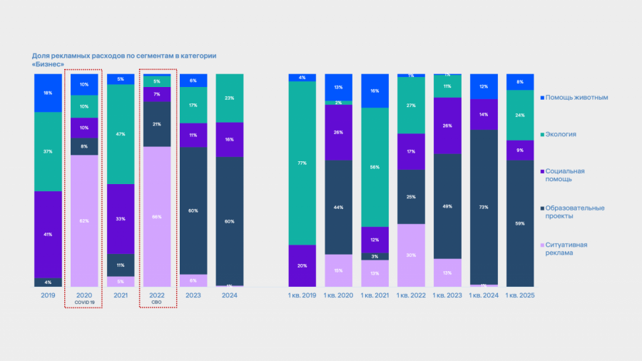 После спада ситуативной рекламы, наблюдаемого с середины 2023 года, бизнес активно переключился на образовательные и экологические инициативы. В первом квартале 2025 года больше половины рекламных расходов (59%) на устойчивое развитие пришлось именно на образовательные проекты брендов.