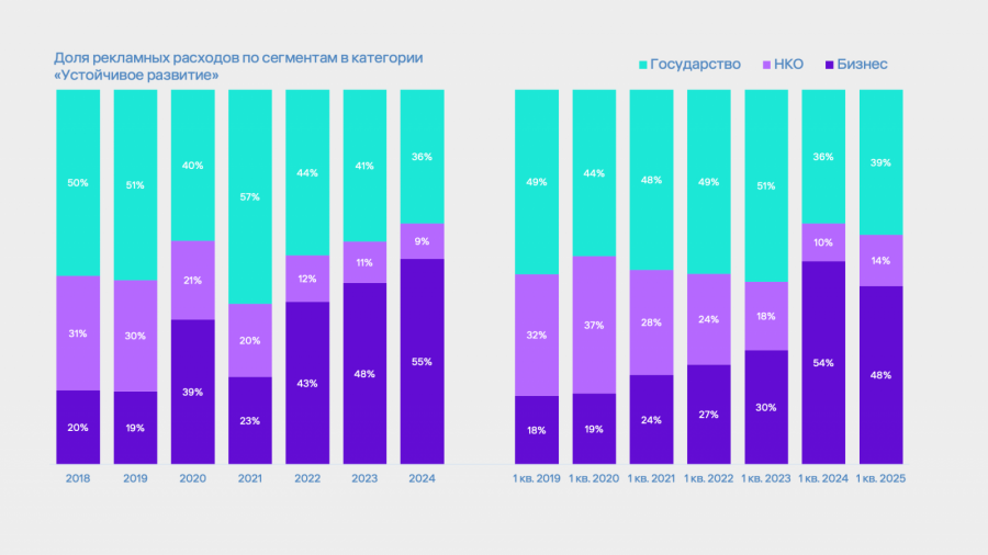 Доля категории «Государство» в 2024−2025 снизилась за счет роста сегментов «Бизнес» и НКО, тем не менее продолжает занимать значительное место — 39% в первом квартале 2025 года.