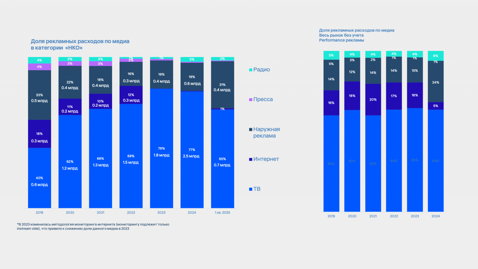 Главное медиа для НКО, как и в целом для всей категории «Устойчивое развитие», — телевидение: на него уходило до 77% всех рекламных расходов в 2024 году и 65% в первом квартале 2025 года. Второй по популярности канал — наружная реклама, на долю которого приходится 31% в первом квартале 2025 года. Интернет, радио и пресса при этом занимают незначительные доли в медиасплите.