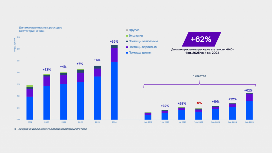 При этом на фоне общего роста помощь бездомным животным показала отрицательную динамику в первом квартале 2025 года (-17%) по сравнению с аналогичным периодом 2024 года. Это единственное направление, где зафиксирован спад. Экологические и смешанные проекты в рамках сегмента НКО остались на прежнем уровне или показали незначительный рост. Они по-прежнему занимают минимальную долю в структуре рекламных расходов и уступают «человекоцентричным» инициативам.