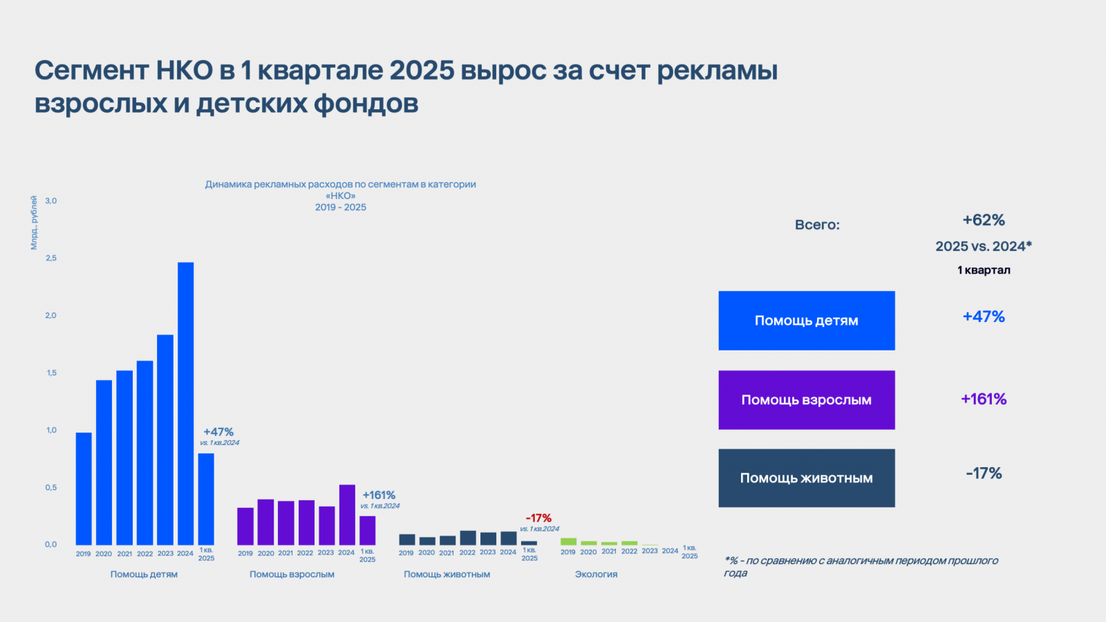 В первом квартале 2025 года сегмент НКО стал лидером по темпам роста в категории «Устойчивое развитие», увеличив рекламные инвестиции на 62% по сравнению с аналогичным периодом 2024 года. Этот скачок был обеспечен в первую очередь фондами, работающими с детьми и взрослыми. Направление помощи детям — традиционно крупнейшее в сегменте НКО. В первом квартале 2025 года оно выросло на +47% по сравнению с аналогичным периодом прошлого года (или 71% от всех медиаинвестиций). Самый бурный рост произошел в подкатегории помощи взрослым — +161% за первый квартал 2025 года vs первый квартал 2024 года.