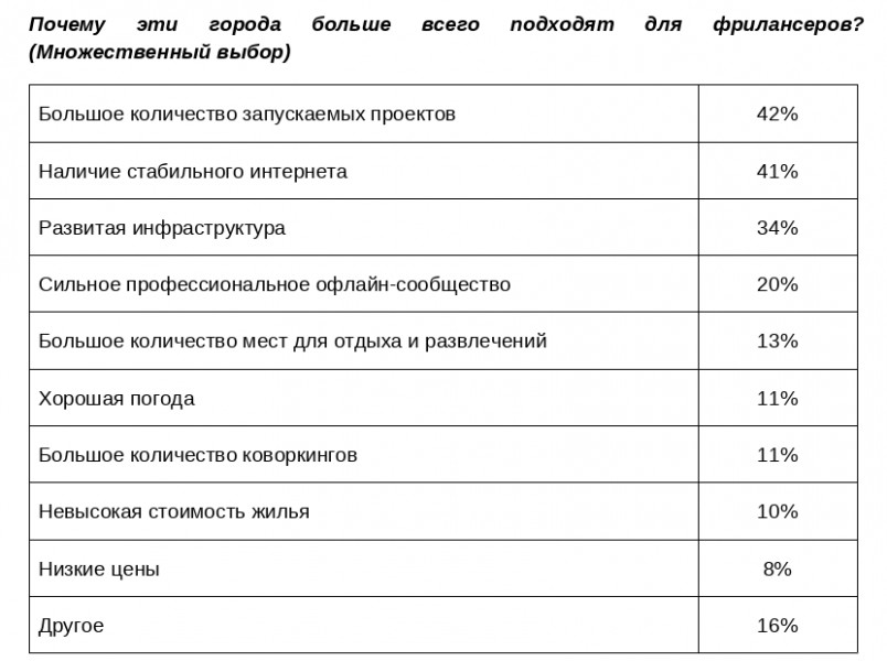 Более половины опрошенных (61%) считают, что город работы для фрилансера не имеет значения, так как такие специалисты, как правило, работают удаленно. При этом 28% респондентов отметили, что лучше всего для фрилансеров подходит Москва. Ещё 12% участников исследования отметили, что работать на фрилансе можно из Санкт-Петербурга. 9% респондентов указали Сочи, 6% — Екатеринбург, а по 4% — Краснодар и Казань.