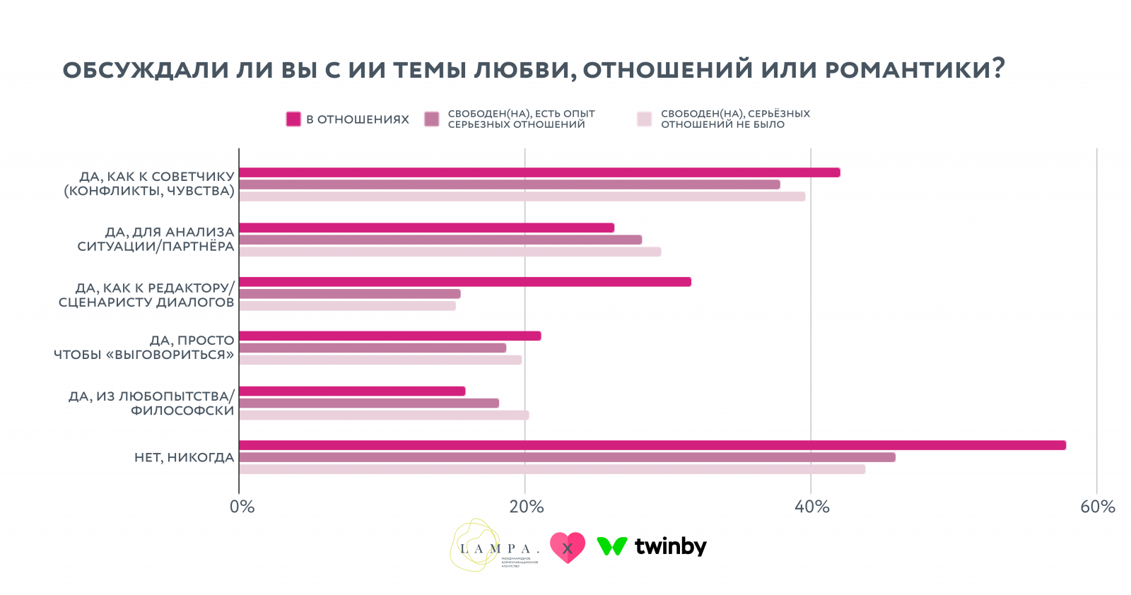 Искусственный интеллект (ИИ) стал полноценным участником разговоров о личной жизни. Почти 40% опрошенных россиян обсуждают с ним реальные отношения и конфликты. Наиболее вовлечена молодежь 18−24 лет: каждый второй использует ИИ как советчика по отношениям, каждый четвертый — просто «выговаривается». Таковы данные исследования, проведенного ко Дню всех влюбленных коммуникационным агентством LAMPA и платформой для онлайн-знакомств Twinby. Отчет есть в распоряжении Sostav.