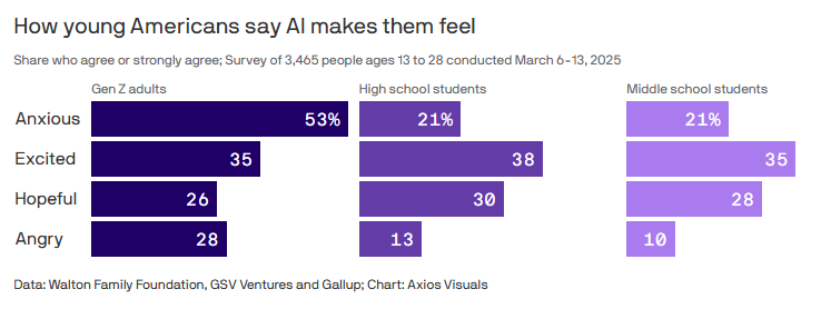 Другое исследование показывает, что отношение поколения Z к искусственному интеллекту за последний год изменилось: подростки и молодые люди в возрасте от 20 до 30 лет стали меньше интересоваться этой технологией и больше — злиться. Доля респондентов поколения Z, которые согласны с тем, что ИИ вызывает у них энтузиазм, снизилась с 36% в прошлом году до 22% в 2026 году.