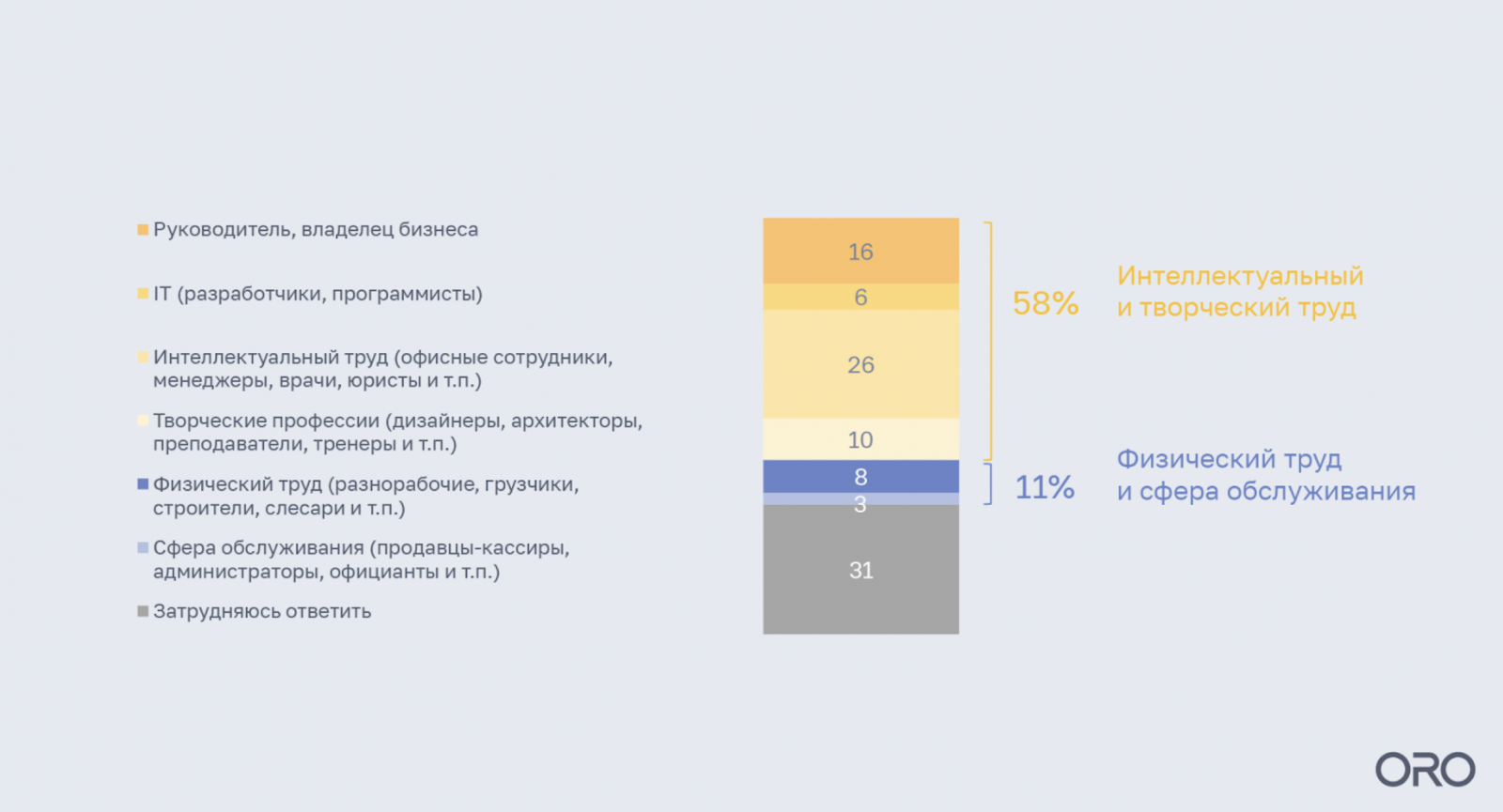 По данным ORO, лишь 1 из 10 сегодняшних «синих» и «серых» воротничков в будущем хочет сохранить этот род занятости, а треть респондентов пока не понимают, кем хотят стать в будущем.