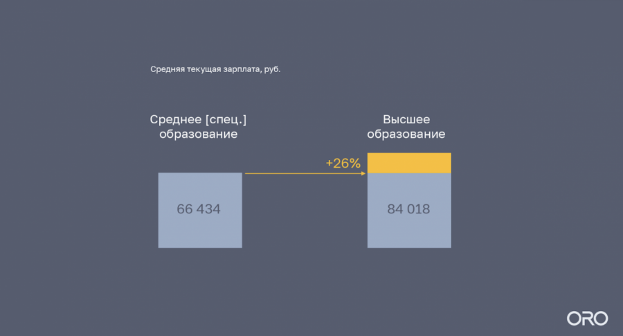 Молодые люди в возрасте 22−25 лет, имеющие высшее образование, зарабатывают в среднем на 26% больше, чем их сверстники со средним или среднеспециальным образованием.