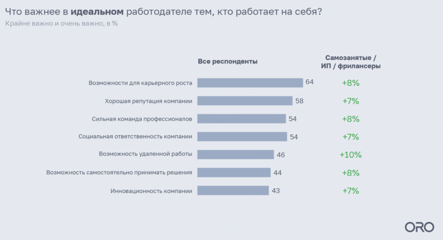 Для 62% респондентов важно ощущать себя «творцом собственной карьеры и жизни». И не все из них видят на рынке «компанию мечты». Так, 46% опрошенных хотели бы работать на себя, поскольку уверены, что самореализация возможна только в собственном бизнесе или личных проектах. 12% зумеров уже занимаются фрилансом, открыли ИП или оформились как самозанятые.