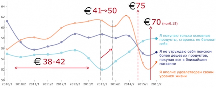 В 2010 году большинство россиян (более 60%) отвечало исследователям, что не утруждает себя поиском более дешевых товаров, предпочитая покупать все в ближайшем магазине. 56% респондентов говорили об удовлетворенности своим уровнем жизни. Теперь об экономии на продуктах и вообще говорят 56% наших сограждан.