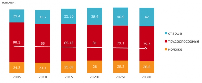 Эта тенденция продолжится, говорит исследование Росстата: к 2030 году число трудоспособных граждан снизится до 73,9 млн. человек, пожилых - вырастет до 42 млн., несовершеннолетних - до 26,6 млн.Для прогноза использовался порог трудоспособности для мужчин 18-60 лет, для женщин - 18-55 лет.
