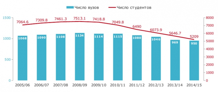 После этого и вплоть до конца 2015 года наблюдалось резкое снижение как числа россиян, получающих высшее образование, так и числа заведений, где оно предоставляется. По состоянию на конец прошлого года число студентов упало до 5,2 млн. человек, а вузов - до 950. В процентном соотношении число студентов сократилось примерно на 30%, а вузов - менее чем на 8%.