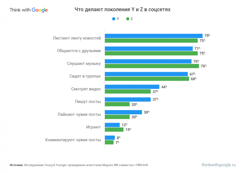 Хотя онлайн — комфортная среда для людей любого возраста, именно поколения Y и Z стараются быть на связи всегда. По сравнению с 2017 годом мессенджеры использовали на 40% чаще, а приложения социальных сетей — на 15%. Выросла доля пользователей мессенджеров: +11% WhatsApp, +5% Viber и +3% Telegram.