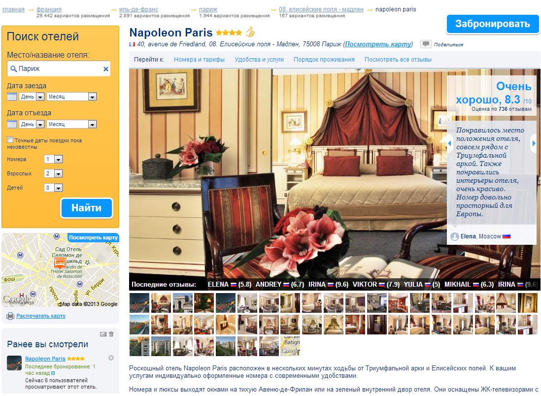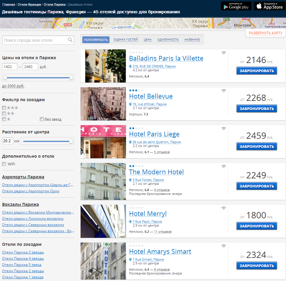 Первый вариант страницы – карточка определенного отеля. Для того, чтобы увидеть все отели Парижа, нужно совершить еще несколько действий: указать даты заезда, выбрать количество человек и т.д.