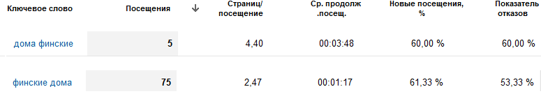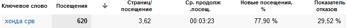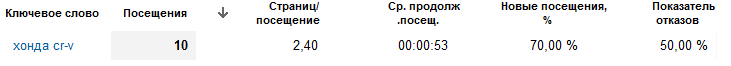 Например, нужно продвинуть сайт компании, занимающейся обслуживанием автомобилей Honda. Среди подобранных запросов − «техническое обслуживание хонда» и «хонда cr-v». Несмотря на высокие позиции сайта (ТОП 5) и хороший спрос по Яндекс.Вордстату, трафик по этим фразам низкий (статистика приведена за месяц):
