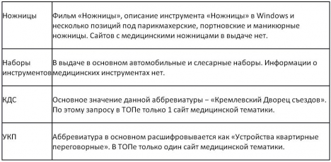 Учитывайте многозначность запросов. Например, вы являетесь владельцем крупного интернет-магазина медицинских инструментов. Сайт серьезный и развитый. Среди ключей есть запросы «ножницы», «наборы инструментов», «КДС» и «УКП». Они соответствуют тематике сайта, однако в результатах поиска по этим запросам вы получите: