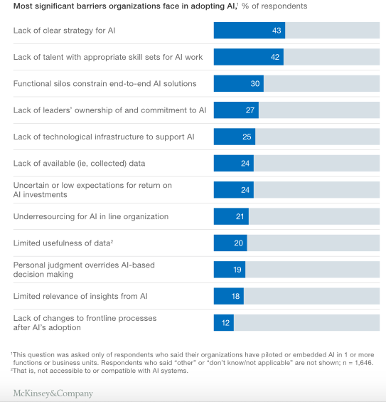 После того, как вы четко определили проблему, важно продуманно создать стратегию и план действий по внедрению ИИ. Звучит легко, но на самом деле это сложный процесс. «ИИ должен быть стратегией, а не решением», — сказал Кристиан Монберг, технический директор компании Zeta Global. В опросе специалистов из компаний в различных отраслях по всему миру, проведенном McKinsey & Company, 43% респондентов отметили, что отсутствие четкой стратегии является основной сложностью в процессе внедрения ИИ и только 18% респондентов заявили, что их компании имеют четкие стратегии.