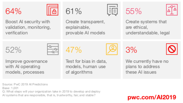 Большинство экспертов сходятся во мнении, что потребители становятся все более чувствительными к тому, как используются их данные. По этой же причине многие бизнес-лидеры планируют инициативы по выстраиванию доверительных отношений с потенциальными клиентами. В отчете PwC о Прогнозах работы ИИ говорится, что безопасность, прозрачность и этика являются главными задачами большинства руководителей США. Этой стратегии придерживается большинство компаний, обрабатывающих большое количество персональных данных, особенно после скандального случая в Facebook и судебного дела Марка Цукерберга.