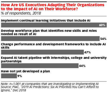 Исследование PwC показало, что 60% руководителей в американских корпорациях, использующих или исследующих ИИ, планировали реализовать инициативы по непрерывному обучению сотрудников по работе с ИИ, 47% планировали изменить структуру производительности и развития, чтобы включить навыки ИИ, и 44% планировали расширять поиск талантливых кадров с помощью внедрения стажировок и развития партнерских отношений с университетами.
