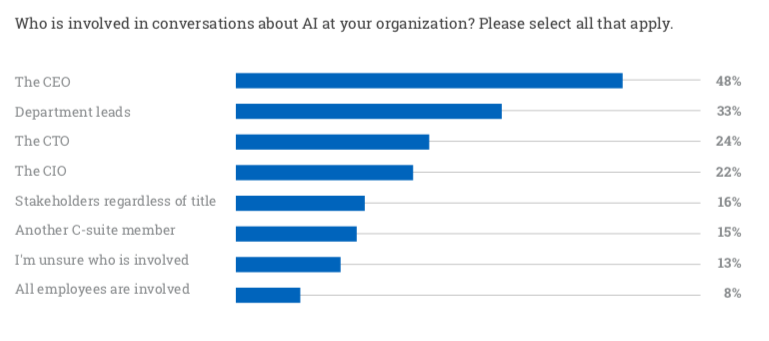 Стоит заметить, что согласно исследованию, получение необходимой поддержки со стороны руководства также имеет решающее значение в момент принятия вопросов по ИИ. Исследование Globant показало, что генеральные директора участвовали в переговорах, связанных с ИИ, примерно в половине (48%) времени, в то время как ИТ-специалисты были задействованы в 22% переговорах. Впоследствии это может вызвать сложности, когда проект необходимо масштабировать или переводить на следующую фазу разработки.