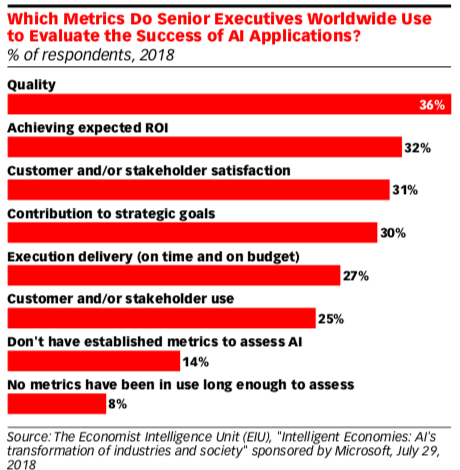 Хотя нет правильного способа измерения производительности ИИ, организации экспериментируют с различными моделями измерения успешности работы ИИ. Например, исследование EIU показало, что качество, рентабельность инвестиций, удовлетворенность клиентов и вклад в достижение стратегических целей являются основными показателями, используемыми для оценки приложений ИИ. Но также выяснилось, что 14% компаний вообще не отслеживали метрики эффективности ИИ.
