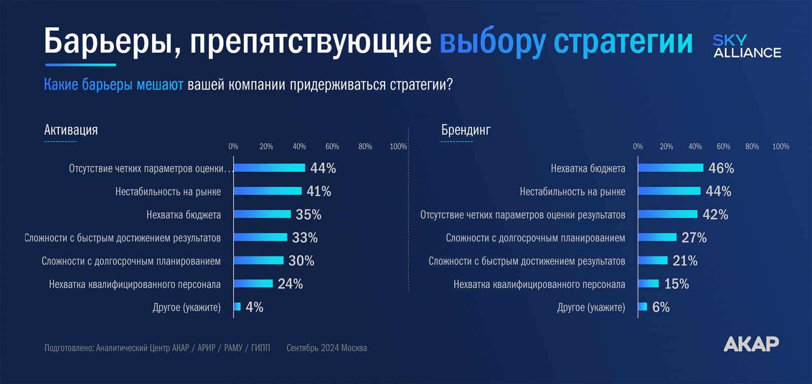 Бюджет — основной фактор выбора стратегии: его нехватку назвали барьером для выбора стратегии брендбилдинга 46% рекламодателей. Такой путь продвижения требует больших вложений, которые окупаются в долгосрочном периоде — не все готовы тратить на это средства. В то же время для активации проблема бюджета стоит лишь на третьем месте (35%).