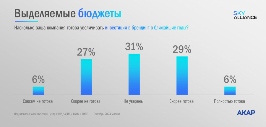При этом увеличивать бюджеты на построение бренда в ближайшие годы готовы лишь 6% рекламодателей, столько же — однозначно не готовы, а 29% указали, что предприятие «скорее готово» наращивать инвестиции.