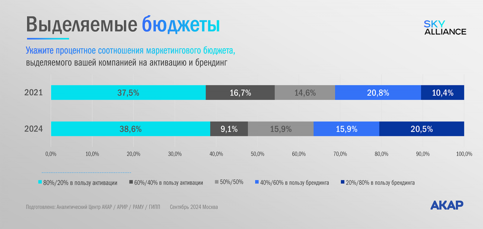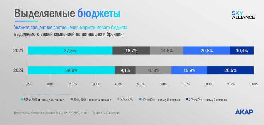 Чаще всего процентное соотношение по бюджетам склоняется в сторону активаций. 38,6% опрошенных указали, что 80% средств в 2024 году выделили на активации против 20% на брендбилдинг