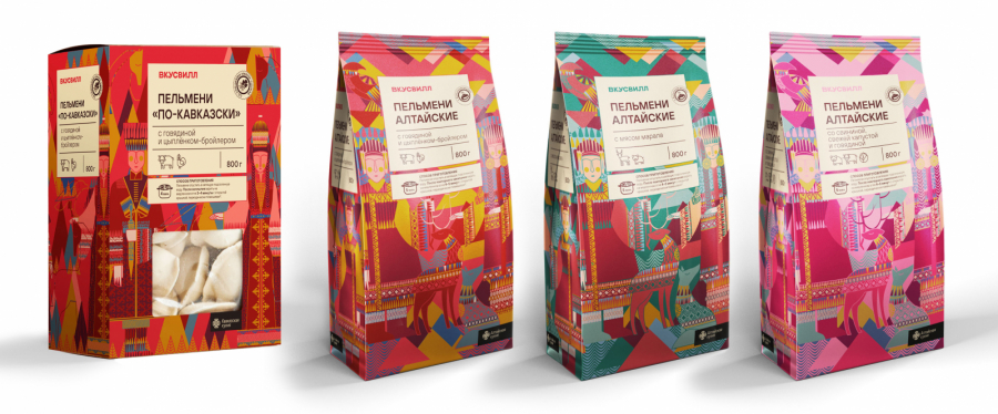 Сеть «ВкусВилл» обновила дизайн линейки региональных пельменей, вдохновившись культурой народов России. Внутренняя команда разработала три концепции и выбрала насыщенную графику с ручными паттернами: силуэты гор, элементы вышивки и текстуры ковров, передающие атмосферу региона. Цвет упаковки соответствует виду мяса — для удобства покупателей. Другие вкусы выйдут в таком же формате до конца лета. Подробнее на Sostav.