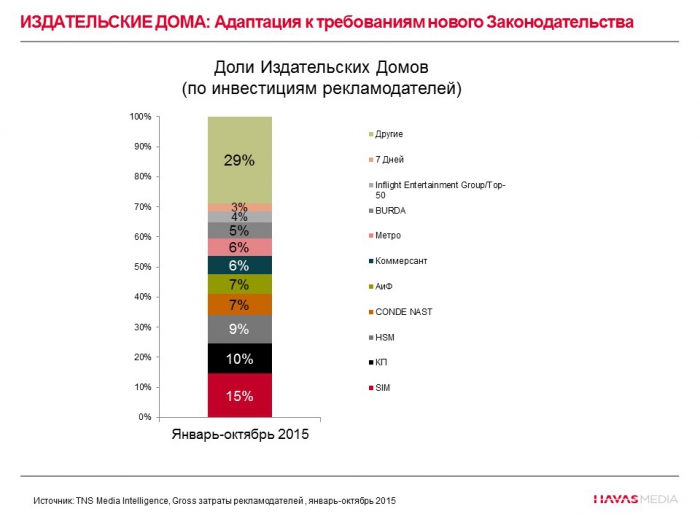 Вступление в действие в феврале 2016 закона, ограничивающего долю иностранного участия в собственности российских медиа до 20%, не внесет существенных изменений в текущую структуру рынка прессы, поскольку большинство Издательских Домов адаптировало свою структуру под новые требования.