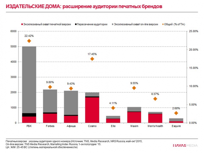 Дальнейшее развитие digital-ресурсов должно в будущем привести к росту аудитории печатных брендов – текущие исследования показывают, что пересечение аудитории печатных и on-line версий незначительно. Развитие новых ресурсов не означает перетекания читателей, а, напротив, открывает доступ к привлечению новых аудиторий.