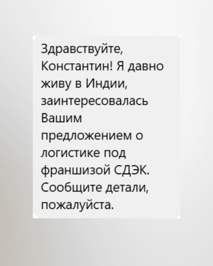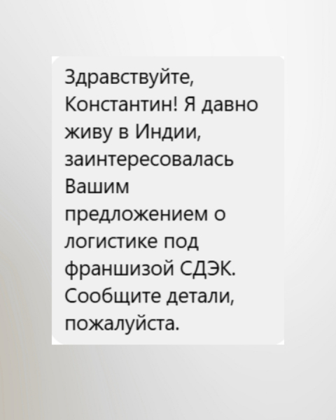 Константин представлялся, кратко рассказывал о своей деятельности и плюсах франчайзинговой модели, а затем предлагал созвониться, чтобы познакомиться и обсудить возможные варианты сотрудничества, если человеку это интересно.
