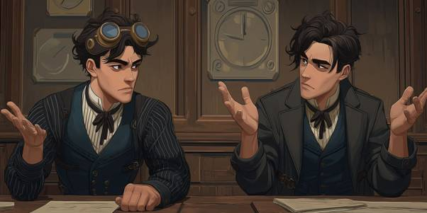 Illustration of two twin men with brown eyes and short dark hair. They are sitting next to each other at a wooden table, facing each other. They are arguing about something, one gesturing animatedly, the other looking at him indignantly. They are dressed in black and white striped shirts in the same steampunk-modern style. A wooden office wall is visible in the background. The overall style is reminiscent of Victorian England (second half of the 19th century). The illustration style is similar to Kyoto Animation anime, with digital art aesthetics and steampunk elements. High image quality, high resolution, sharp edges.