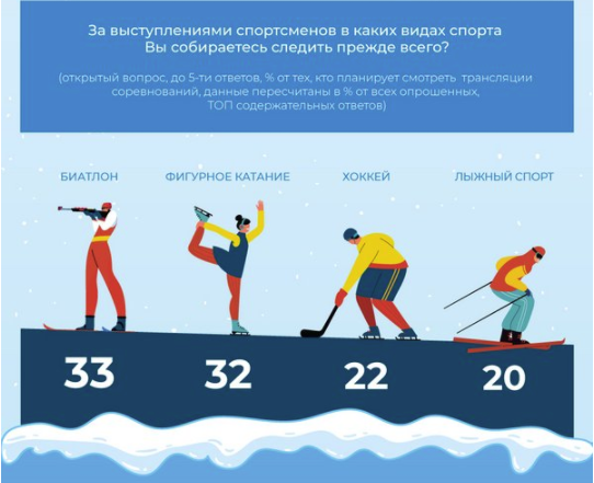 В первую очередь наши сограждане будут смотреть соревнования по биатлону (33%) и фигурному катанию (32%), каждого пятого интересуют хоккей (22%) и лыжный спорт (20%), 7% намерены следить за соревнованиями конькобежцев.