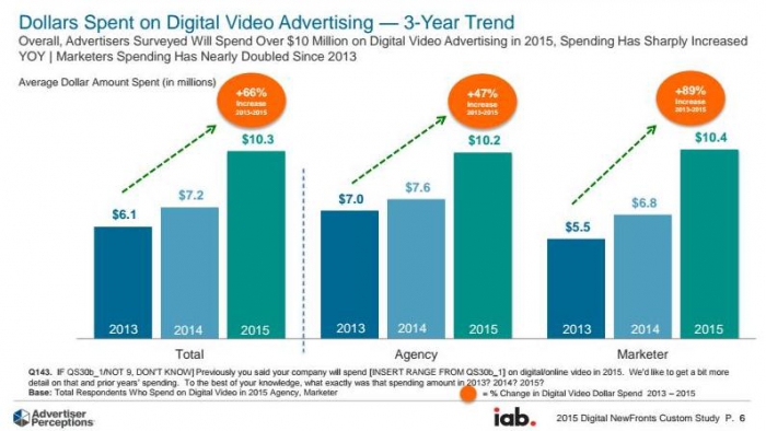 Итоговая сумма расходов на digital в этом году, согласно новому исследованию IAB («Digital Content NewFronts: Digital Video Spend»), составит $10,4 миллионов. Это на $3,6 миллионов больше показателей прошлого года и на $4,9 миллионов – позапрошлого. В итоге за три года digital вырос на 89%, и, по прогнозам IAB, digital уверенно продолжит свой рост в следующем году (в основном за счет роста рекламных бюджетов компаний).