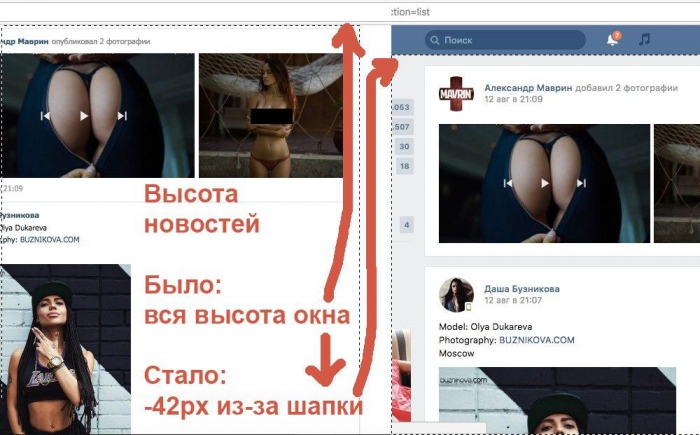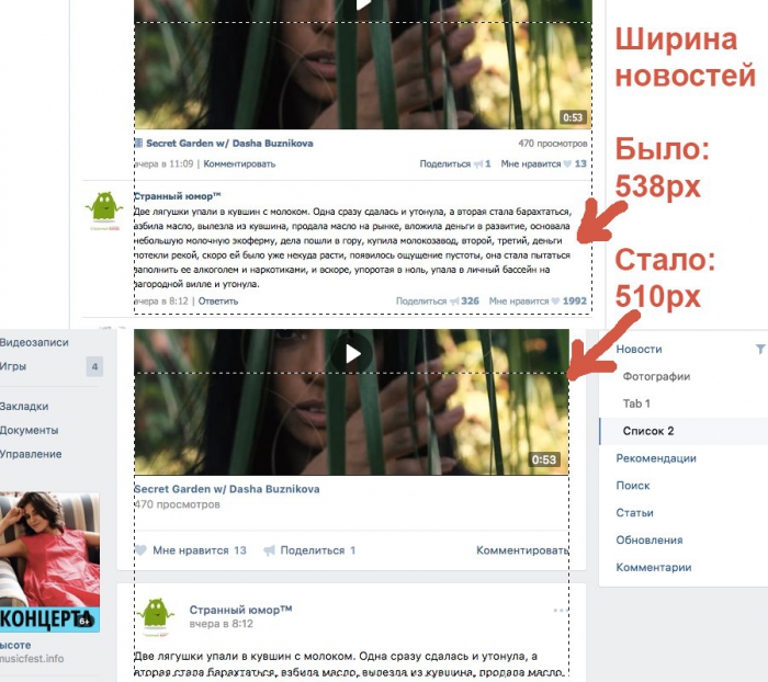 5. Статичная левая колонка при промотке старых записей личных страниц не только не дает нужной информации, но и сужает горизонтальное пространство для просмотра записей по сравнению со старой версией. Аналогичная ситуация – при просмотре записей в группах и пабликах.