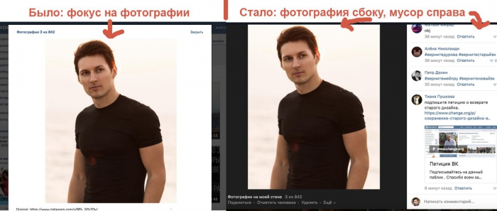 4. При просмотре фотографий утрачен фокус на самой картинке. Фотографии смещены влево, а яркое пятно белой колонки комментариев, появившейся справа, перетягивает на себя фокус внимания. Это решение было скопировано c Facebook, который в свое время ввел правую колонку для размещения дополнительных рекламных блоков.