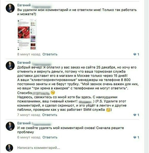 Удалить негативные комментарии — значит спрятаться от аудитории, признать поражение и закрепить наличие проблем, связанных с работой компании в сознании клиента. Разъярённый клиент, которому отказали в праве на обратную связь, или выясняет отношения с компанией в повторных комментариях на её странице, или разворачивает антирекламную кампанию в своем профиле, снабжает посты тегами, их охотно репостят фоловеры пострадавшего, и в дальнейшем именно они индексируются поисковиком соцсети при поиске информации о товаре или услуге.