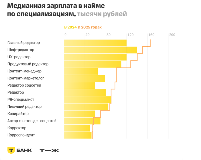 Из линейных должностей выделяются UX-редакторы и продуктовые редакторы. В их обязанности зачастую входит не только написание текста, но и, например, взаимодействие с дизайнерами, разработчиками, маркетологами. Самая низкооплачиваемая работа — у копирайтеров, авторов текстов для соцсетей, корректоров и корреспондентов.