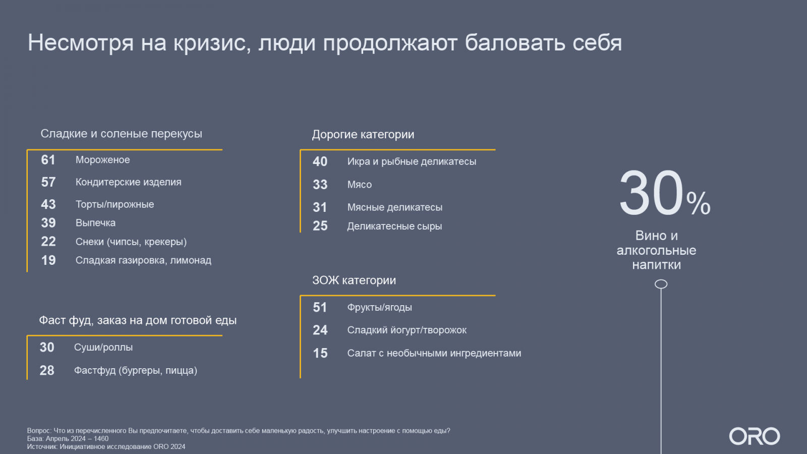 Несмотря на инфляцию и стремление сэкономить, россияне любят порой побаловать себя дорогими и не всегда полезными для здоровья продуктами. 72% признают, что позволяют себе «маленькую роскошь» в еде ради удовольствия. А 65% позволяют себе вкусные, хоть и не полезные продукты.