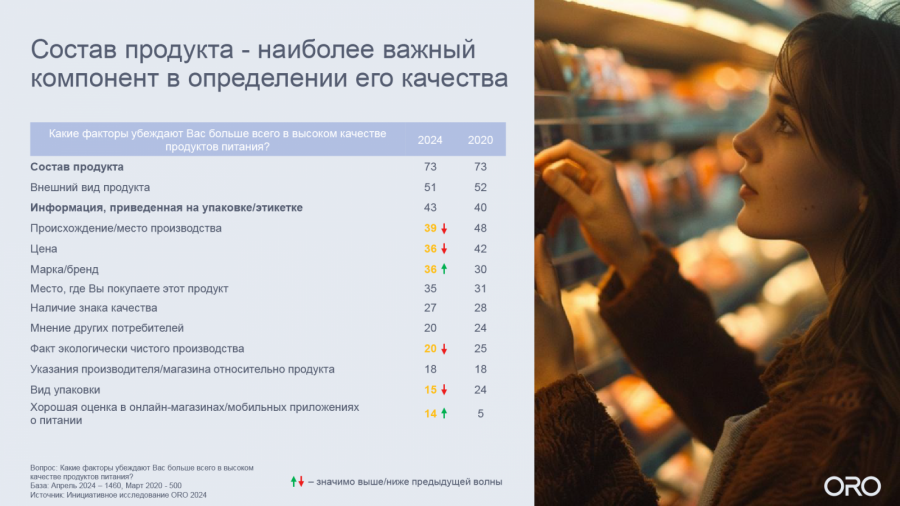 У россиян состав продукта — важнейший компонент в определении его качества. Следом идут внешний вид и информация на упаковке. Это показывает, как важно брендам быть открытыми и понятно рассказывать о своем продукте. Оценки в онлайн-магазинах и приложениях питания стали одним из самых быстрорастущих факторов за последние четыре года. Диджитал все больше определяет выбор — потребители ориентируются на рейтинги и отзывы.