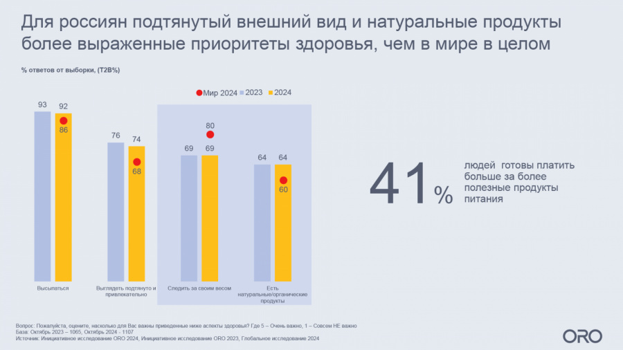41% россиян готовы платить больше за полезные продукты питания. Для россиян здоровье больше связано с подтянутой фигурой и натуральными продуктами, чем у жителей других стран. Потому наиболее популярные изменения в потребительских привычках — это переход на ЗОЖ (34%) и сокращение потребления сахара, соли, жиров (33%).