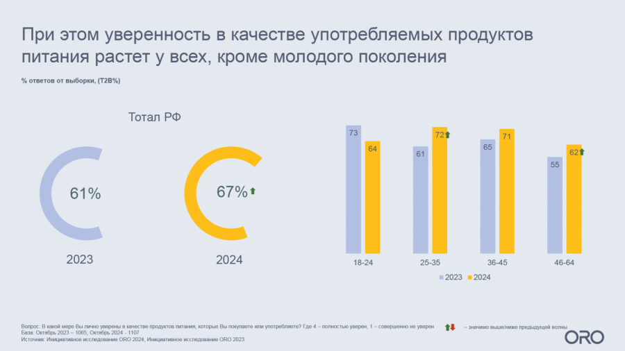 67% жителей России уверены в качестве употребляемых продуктов. Что немаловажно этот показатель вырос в сравнении с прошлым годом среди всех возрастных категорий, кроме молодого поколения.