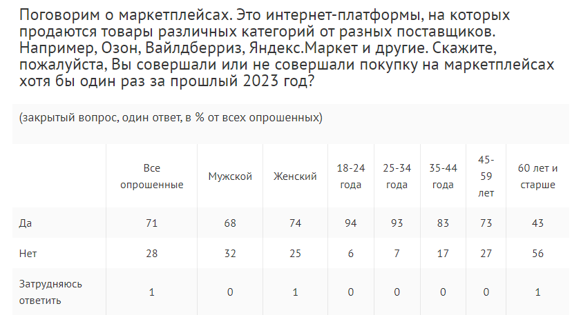 Чаще покупки на маркетплейсах совершают женщины (74% против 68% мужчин), граждане с высшим и неоконченным высшим образованием (80%), горожане, а также активные интернет-пользователи. Наибольшей популярностью онлайн-шопинг пользуется у 18−34-летних, реже практикуют его представители старшего поколения.