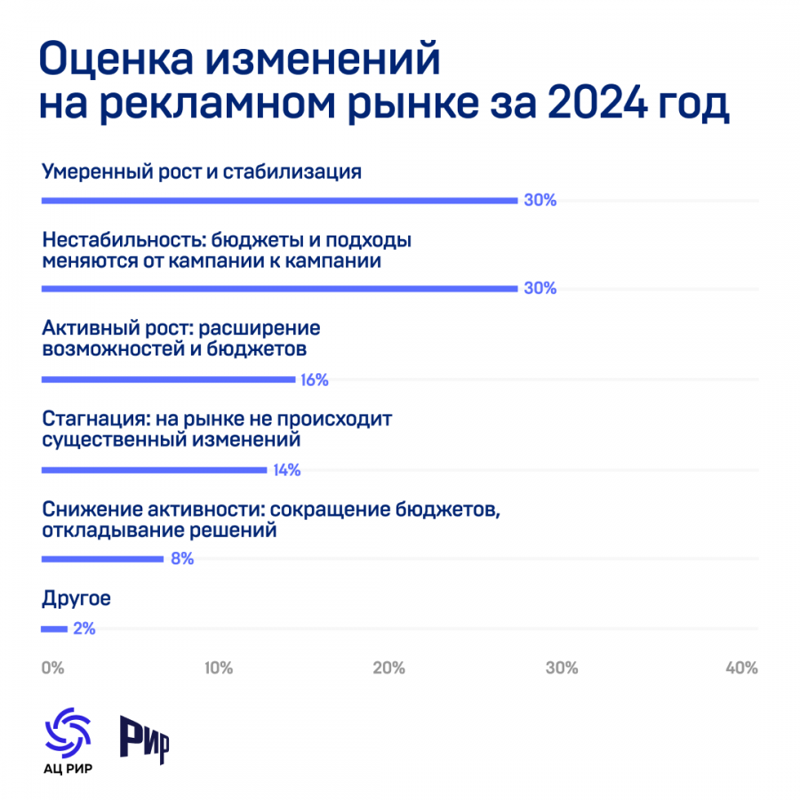 На фоне роста рекламного рынка на 24% в 2024 году треть рекламодателей оценивают ситуацию как нестабильную: бюджеты меняются от кампании к кампании. 46% воспринимают прошедший год как положительный.