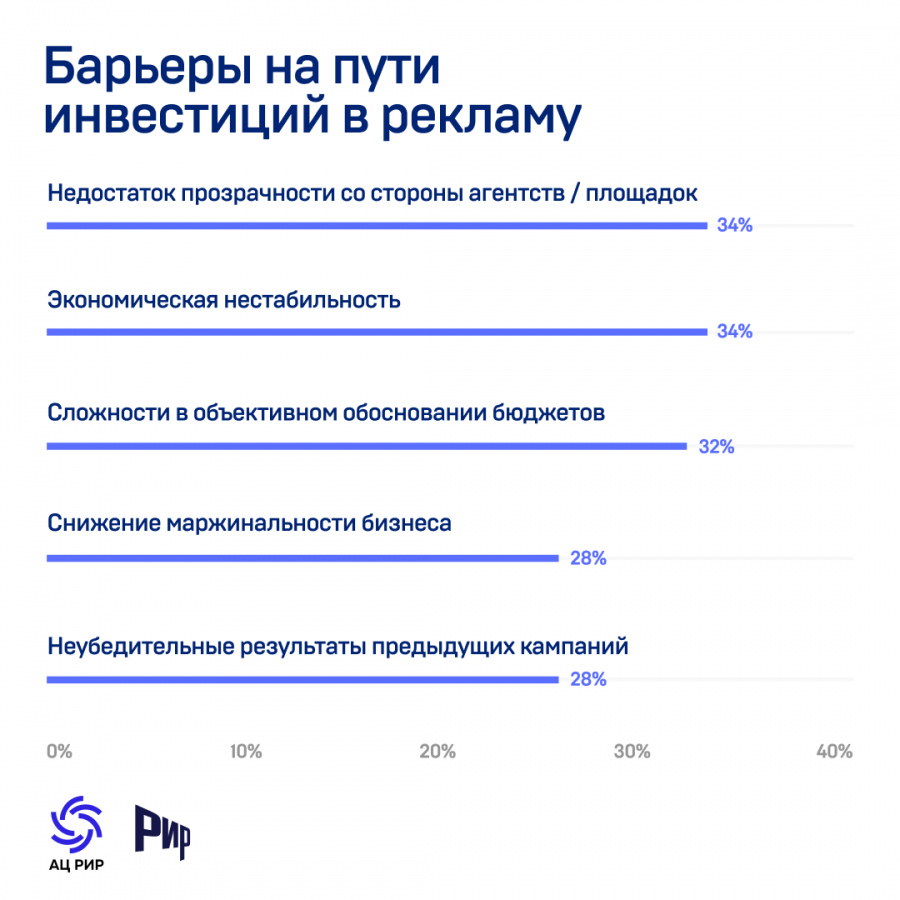 Препятствиями для увеличения рекламных инвестиций в прошлом году стали недостаток прозрачности со стороны агентств и рекламных площадок (34%), экономическая нестабильность (34%) и сложности в объективном обосновании медиабюджетов (32%).
