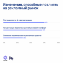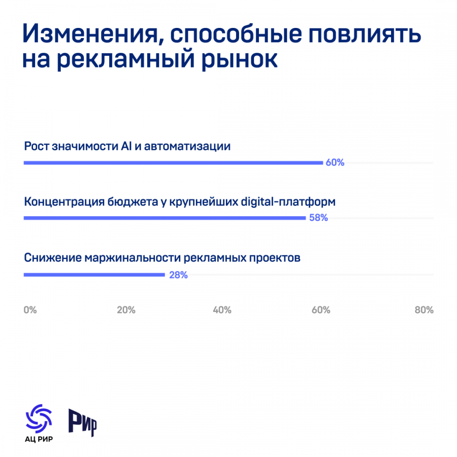 В качестве ключевых факторов, способных повлиять на рынок в ближайший год, рекламодатели называют рост значимости ИИ и автоматизации (42%) и концентрацию бюджетов у крупнейших диджитал-платформ (40%). Основным драйвером изменений становится запрос на эффективность и технологичность маркетинга.