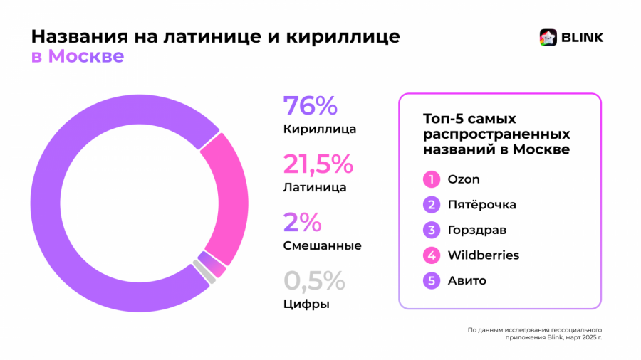 Аналитики геосоциального приложения для шеринга локации с друзьями Blink решили выяснить, какое количество названий в Москве и Санкт-Петербурге на сегодняшний день написано латиницей, а какое — кириллицей. Для анализа использовалась информация о зарегистрированных объектах из геосоциального приложения Blink, включая названия магазинов, кафе и ресторанов, офисов, компаний, государственных учреждений, пунктов выдачи, улиц и остановок.