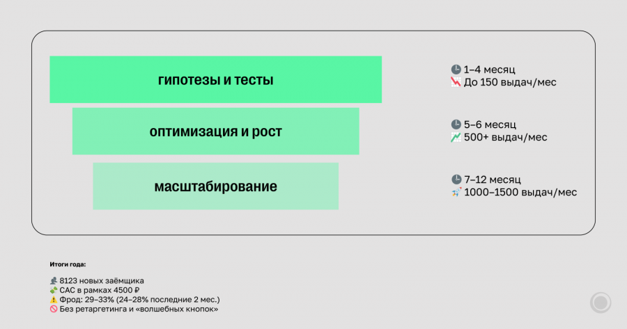 Через полгода работы удалось добиться стабильных 500+ выдач займов в месяц. Еще спустя три месяца — выйти на отметку 1 000−1 500 выдач ежемесячно.
