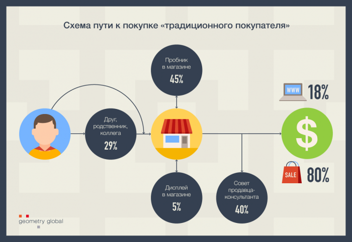 Путь к принятию решения о покупке «традиционного покупателя» достаточно простой и включает небольшое число шагов. Такой покупатель в большинстве случаев сразу идет в магазин, там выбирает товар, пробует при наличии такой возможности либо получает дополнительную информацию от продавца-консультанта, совершает покупку.