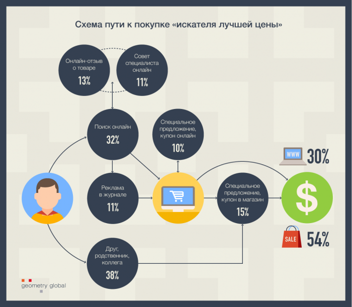 Архетип 3. «Искатели лучшей цены» – покупатели, которые точно знают, что им нужно, и ищут лучшее ценовое предложение в онлайне либо офлайне. В отличие от предыдущего архетипа, процесс поиска направлен не на выбор товара, а на выбор самой низкой цены и наиболее выгодного места покупки. Путь к покупке обычно включает поиск акций и специальных предложений, купонов со скидкой.