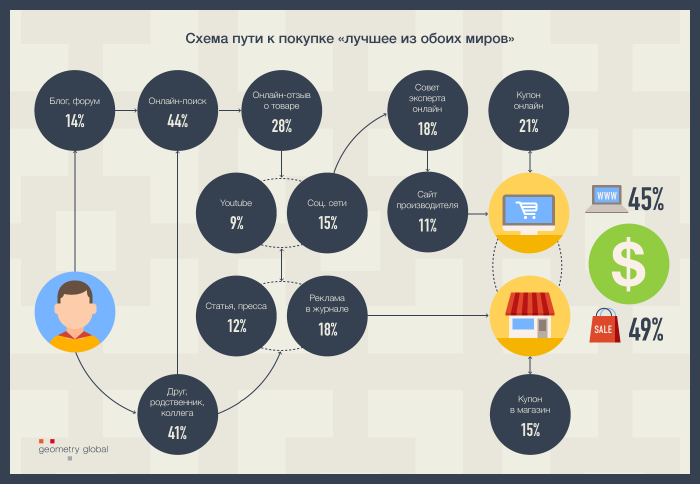 С целью определения закономерностей в процессе принятия решения о покупке Geometry Global с 2011 года проводит специальное исследование Connected Shopper. Как показывают его данные, для многих категорий товаров путь к покупке проходит через цифровые медиа, независимо от того, где совершается сама покупка, в онлайне или офлайне. Покупатели в большей или меньшей степени используют поиск информации, сравнение цен, сравнение альтернативных товаров, поиск магазина или акции, рекомендации и мнения экспертов. Данные исследования помогли выделить и сформулировать основные модели поведения покупателей – так называемые архетипы.
